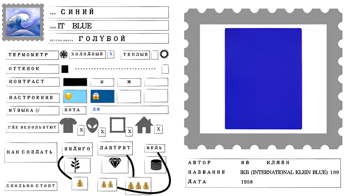 [spoiler show=”как это сделать ⇐”][/spoiler]В рамке рядом с именем нарисуй СИНИЙ В ПРИРОДЕ (небо, море…)Заполни имя по-итальянски и другие имена цвета«Настроение»: нарисуй разные с смайлики на синем фоне, согласно эмоциям который он вызывает н-р: темно-синий – 😱 нежно-голубой ☺️. Это задание можно совместить с Небесным Дневничком 👇В рамке на отдельной странице сотвори СВОЙ АВТОРСКИЙ СИНИЙ: помощью 3-х цветов: синий, белый и черный с добавлением воды. Вспомни, почему черного можно добавлять крайне мало. Используй акварельные карандаши, акварель или гуашь.Придумай своей картине название и подпиши, например, как у Ива Кляйна 👇
