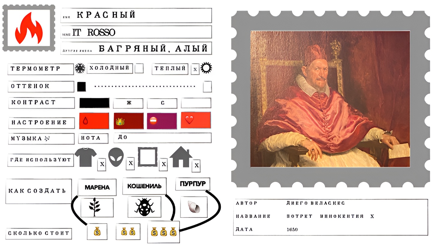 Мы обсудили какие чувства вызывает разный красный. Мы вспомнили, что красный цвет означает ноту ДО, богатство или опасность. Мы внимательно рассмотрели портрет Римского Папы кисти Веласкеса и выяснили, что красные одежды здесь не случайно: могущественный правитель не был добрым человеком.